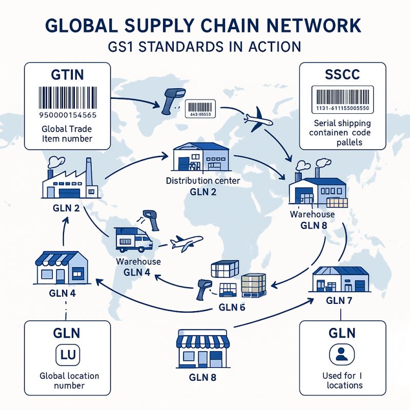 - GLN (Global Location Number) – Identifies the origin or destination (like factories or stores)
