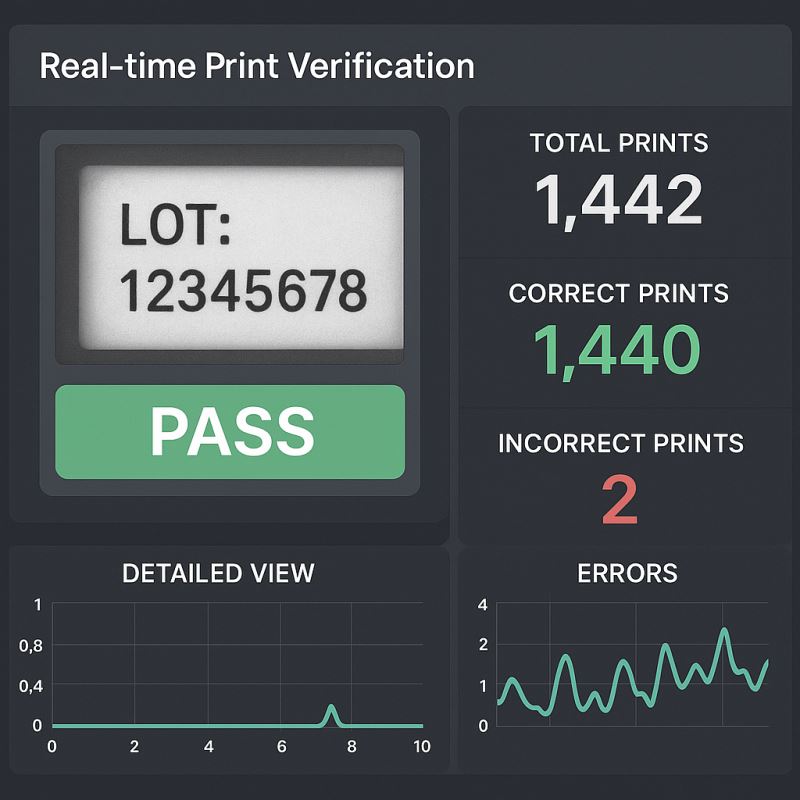 Modern vision systems equipped with industrial cameras continuously inspect every printed element: - Verifying presence, clarity, and contrast - Grading 2D barcodes in real-time - Alerting operators instantly if the print is smudged, missing, or unreadable